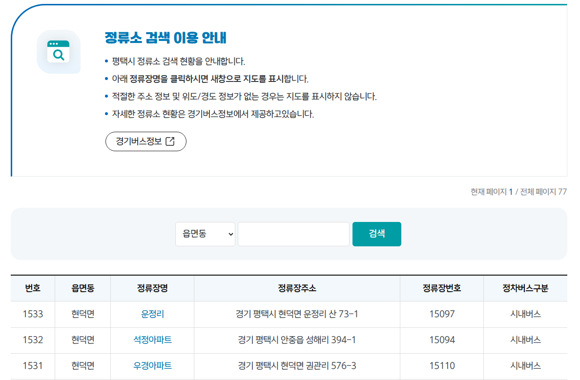 자세한 정류소 현황은 경기버스정보에서 제공하고있습니다.