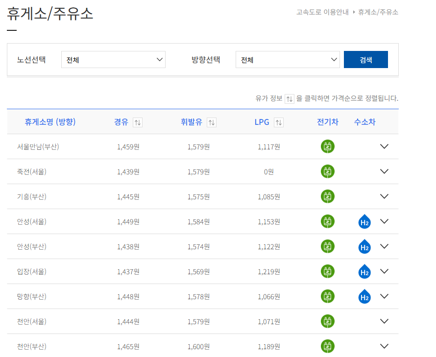 휴게소에 있는 주유소 (기름에 종류별로 가격을 알려줌)