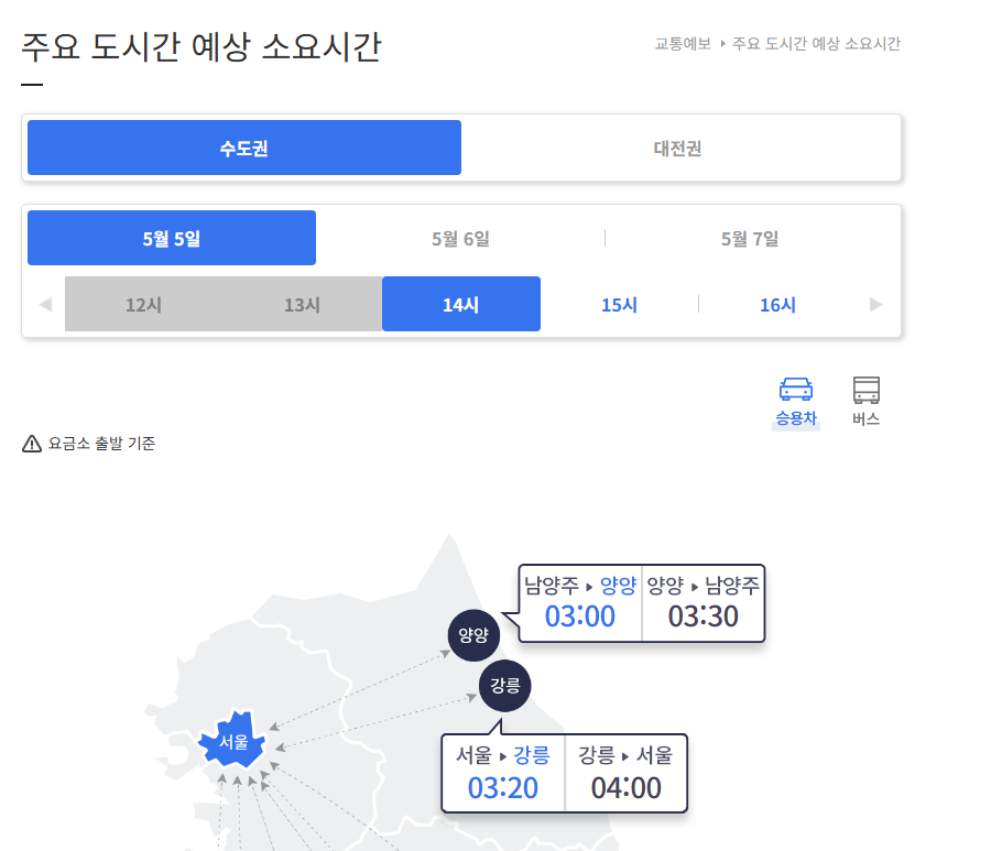 도시에서 수도권으로 예상 소요시간을 검색할 수 있습니다.
