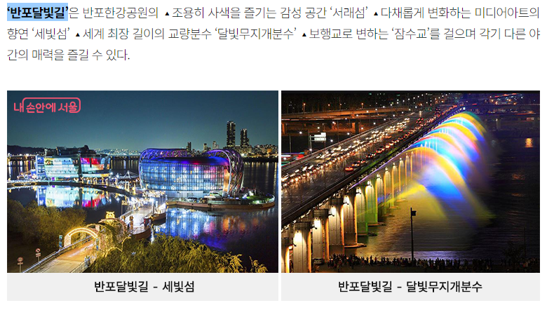 휴식형 투어 프로그램으로,반포달빛길(반포한강공원)과 여의별빛길